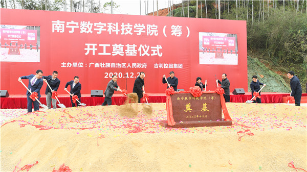 中国教育在线讯 12月20日上午,南宁数字科技学院(筹)在南宁市江南区友谊路举行开工奠基仪式。全国工商联副主席黄荣、广西壮族自治区副主席费志荣、广西壮族自治区政协副主席磨长英、广西壮族自治区党委教育工委专职副书记李晓勇、南宁市副市长朱会东,吉利控股集团董事长李书福、吉利人才发展集团副董事长王兴贵、吉利人才发展协同委员会主席陆丹、吉利控股集团副总裁杨学良等领导嘉宾出席奠基仪式。全国工商联副主席黄荣宣布项目开工,广西壮族自治区政府副秘书长黄植建主持仪式。