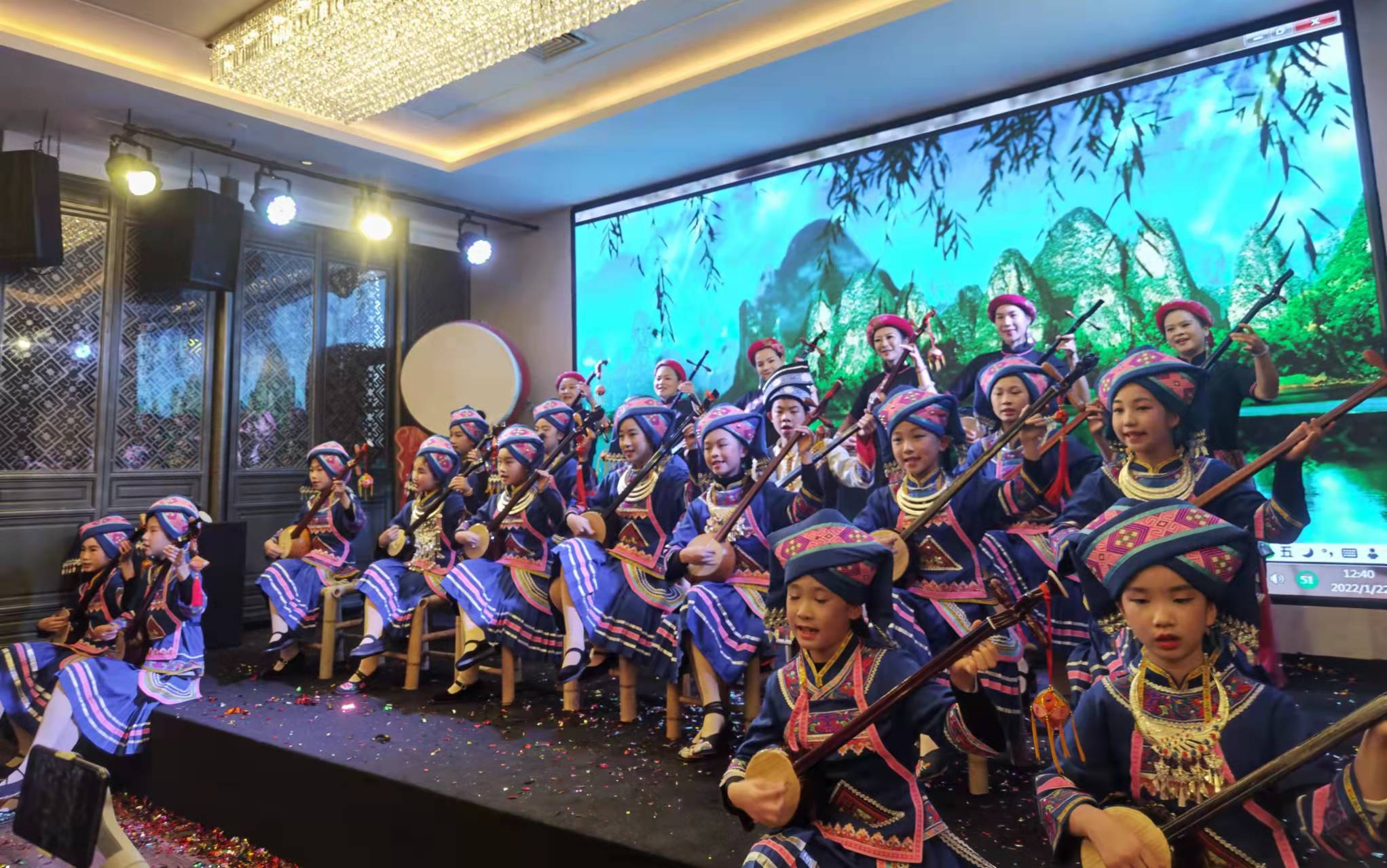 元月22日上午,随着动听的刘三姐歌声响起,在具有广西民族文化特色的桂人来·广西菜(江南店)2楼多功能厅,著名主持人艾米和洪锋身着亮丽的民族服装,用动听而专业的主持词宣布:由广西刘三姐文化研究会、广西春艳民族艺术工作室与广西桂风壮韵文化艺术交流中心联合举办的2022年(虎年)新春年会感恩答谢盛典新闻发布会及企业授牌仪式活动现在开始。有嘉宾、企业家代表、新闻媒体代表以及黄春艳、李海燕、刘春雨演艺团队共100多人出席了本次活动。